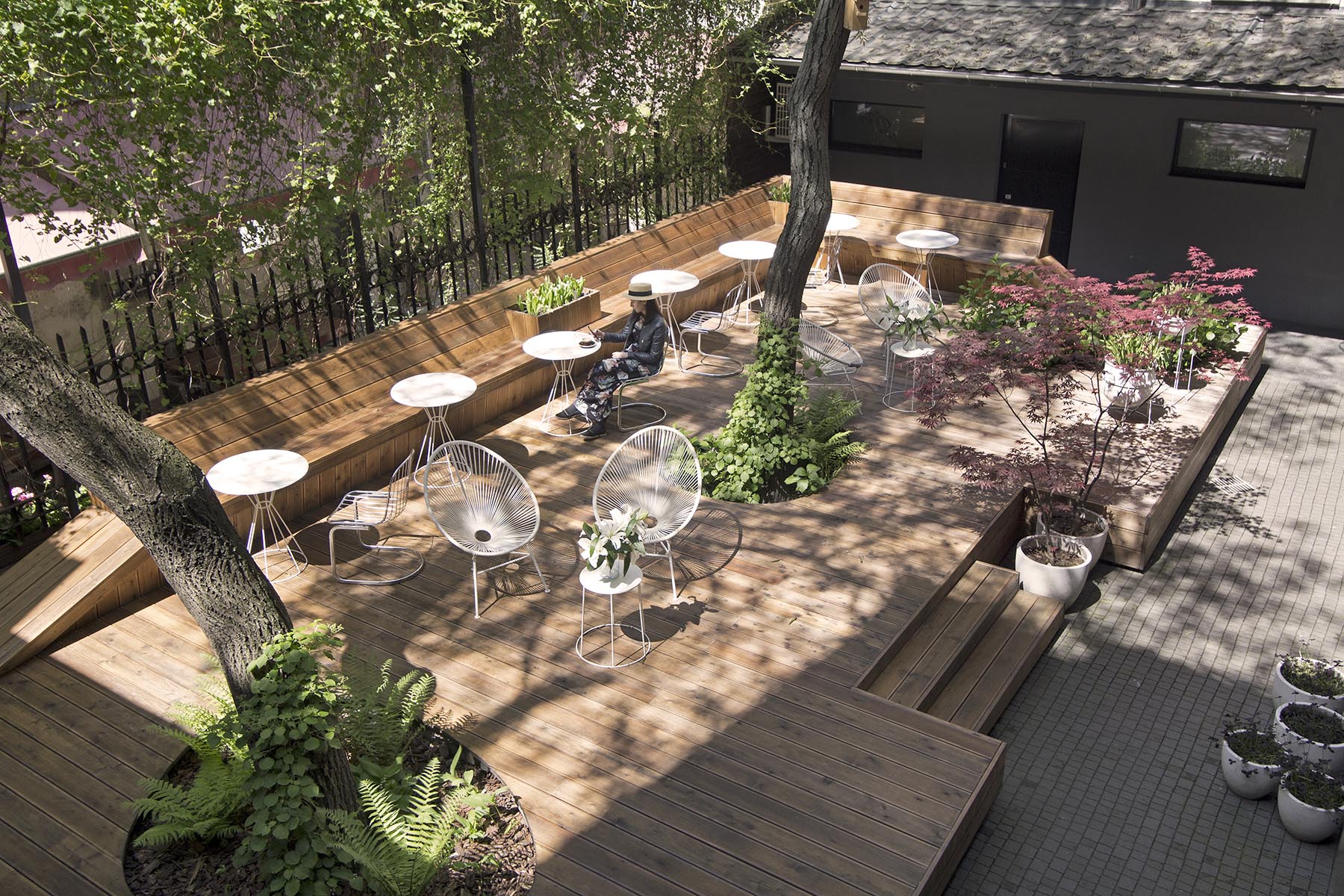 A green area with cosy chairs, hidden from the crowdy street of Dluga.