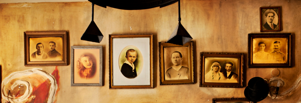 A small bar with photos of ancesters hanging on the wall.