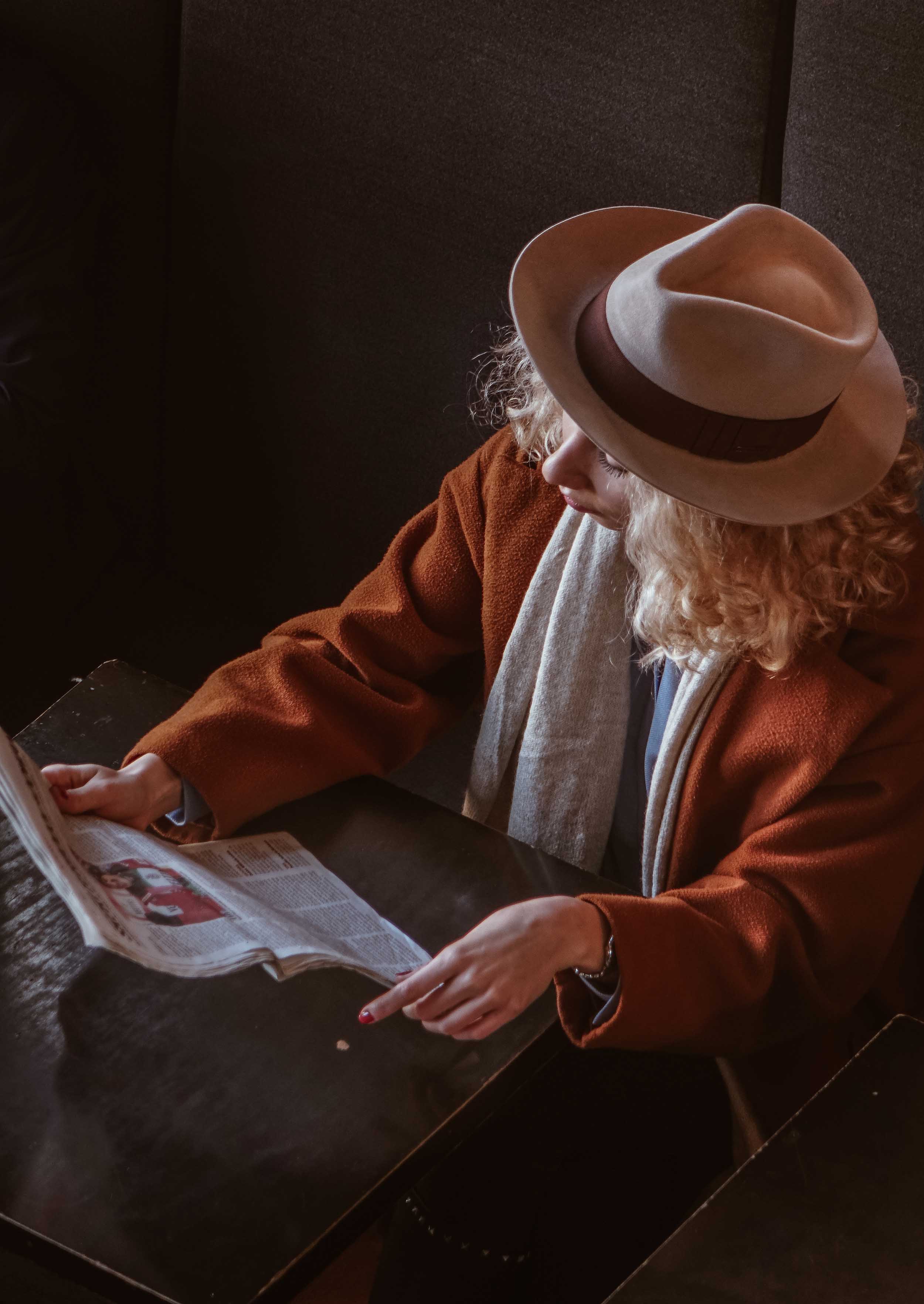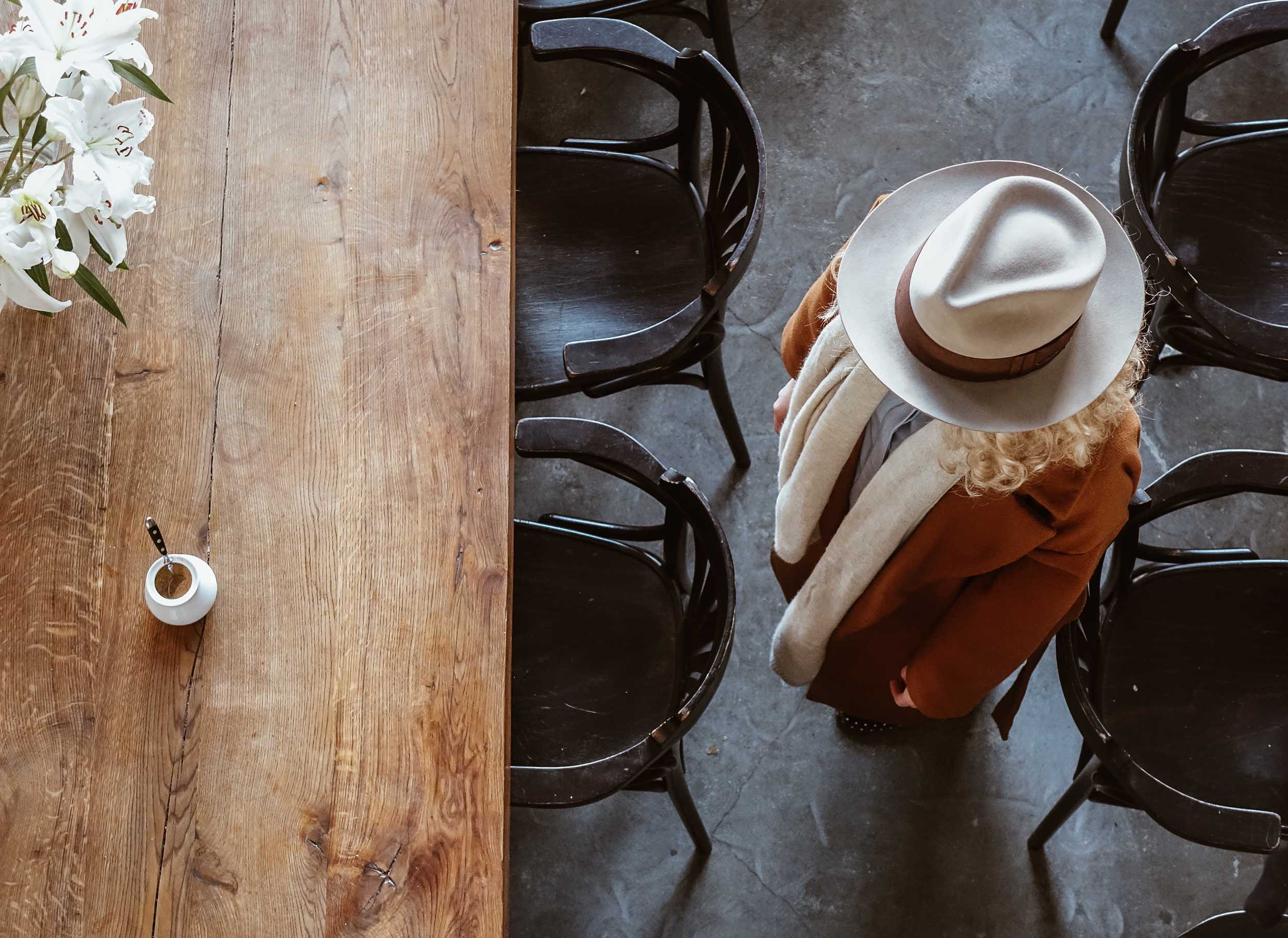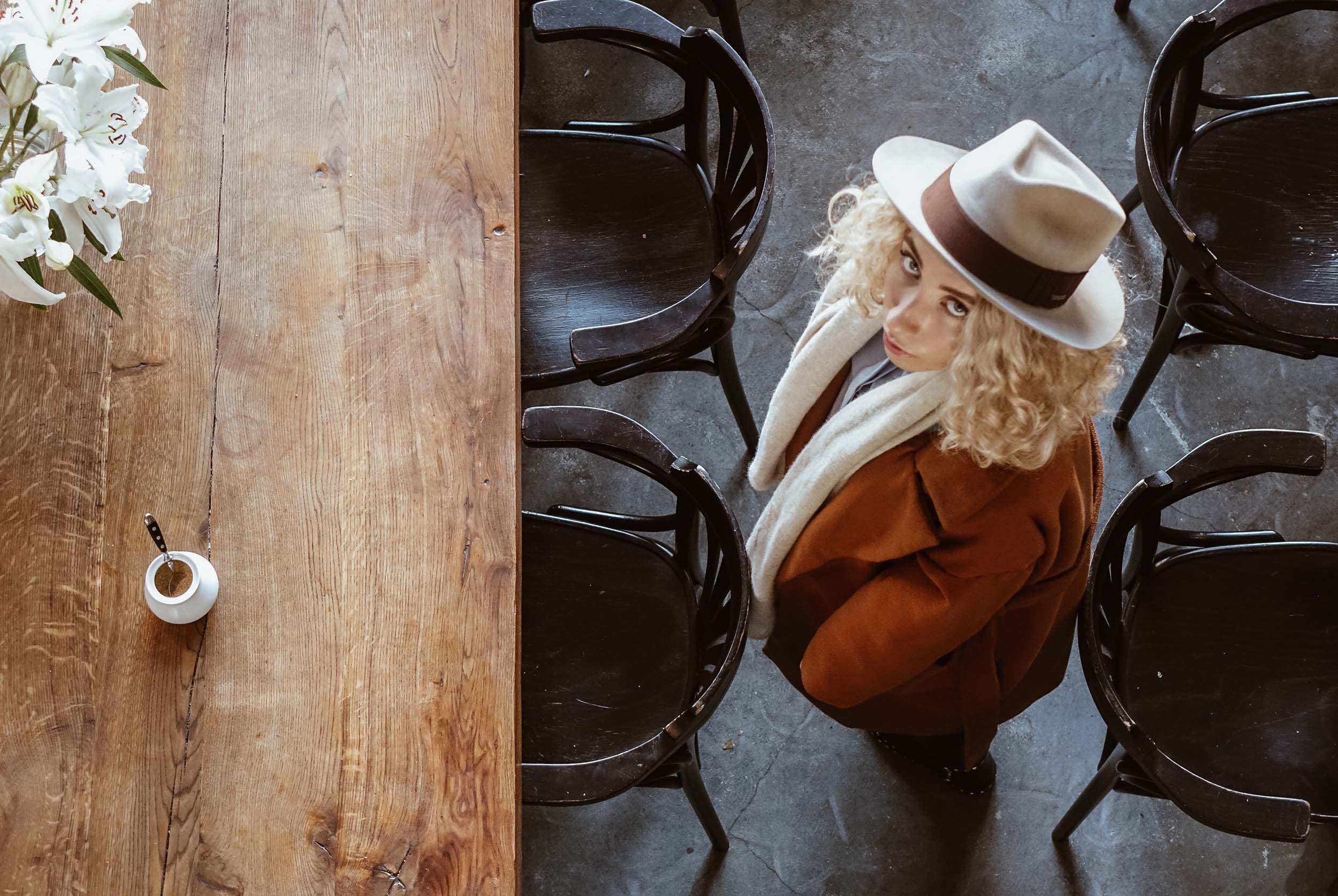On this photo taken from the balcony, Sofi wears a Sand Fedora in Furfelt.