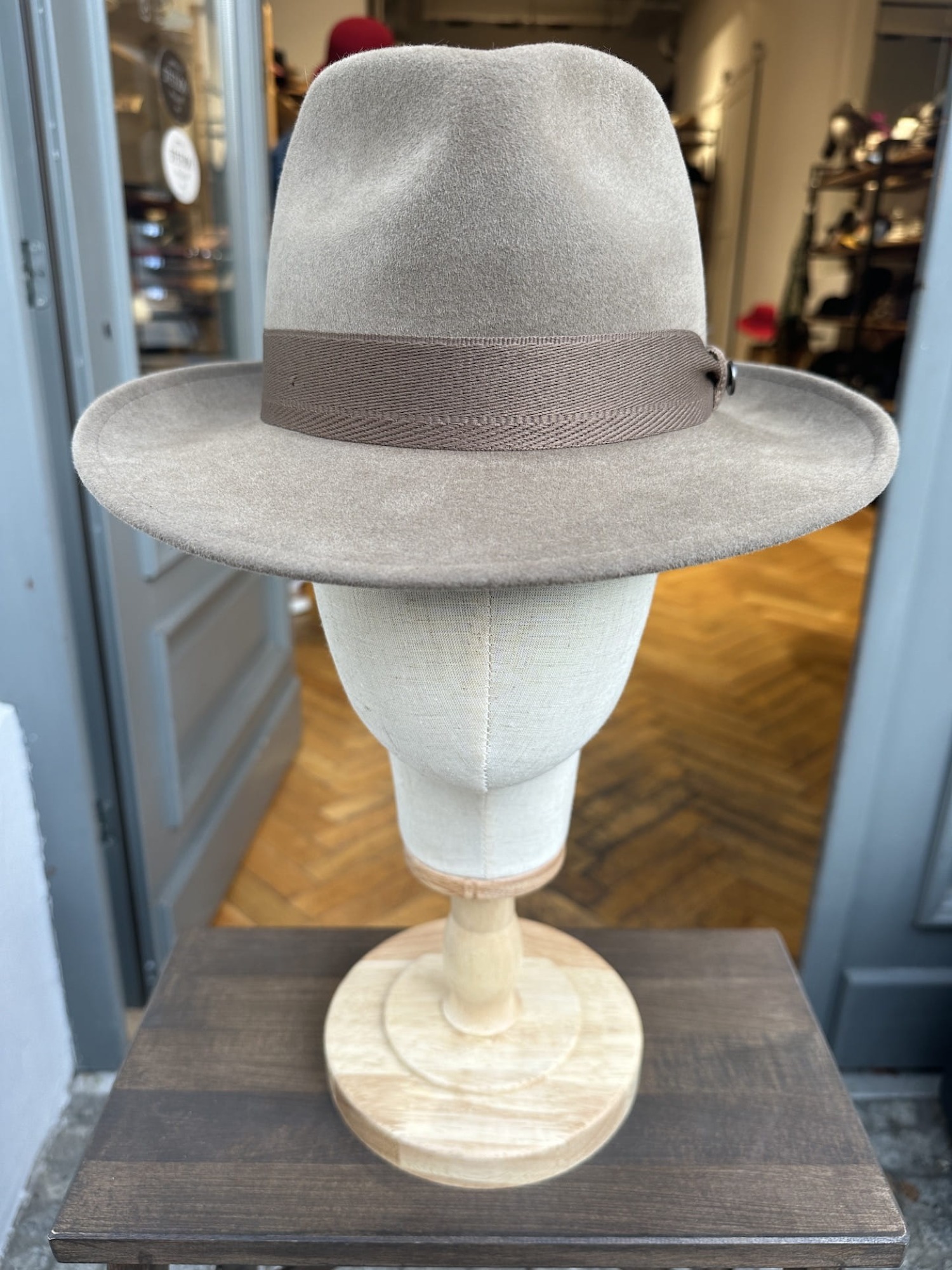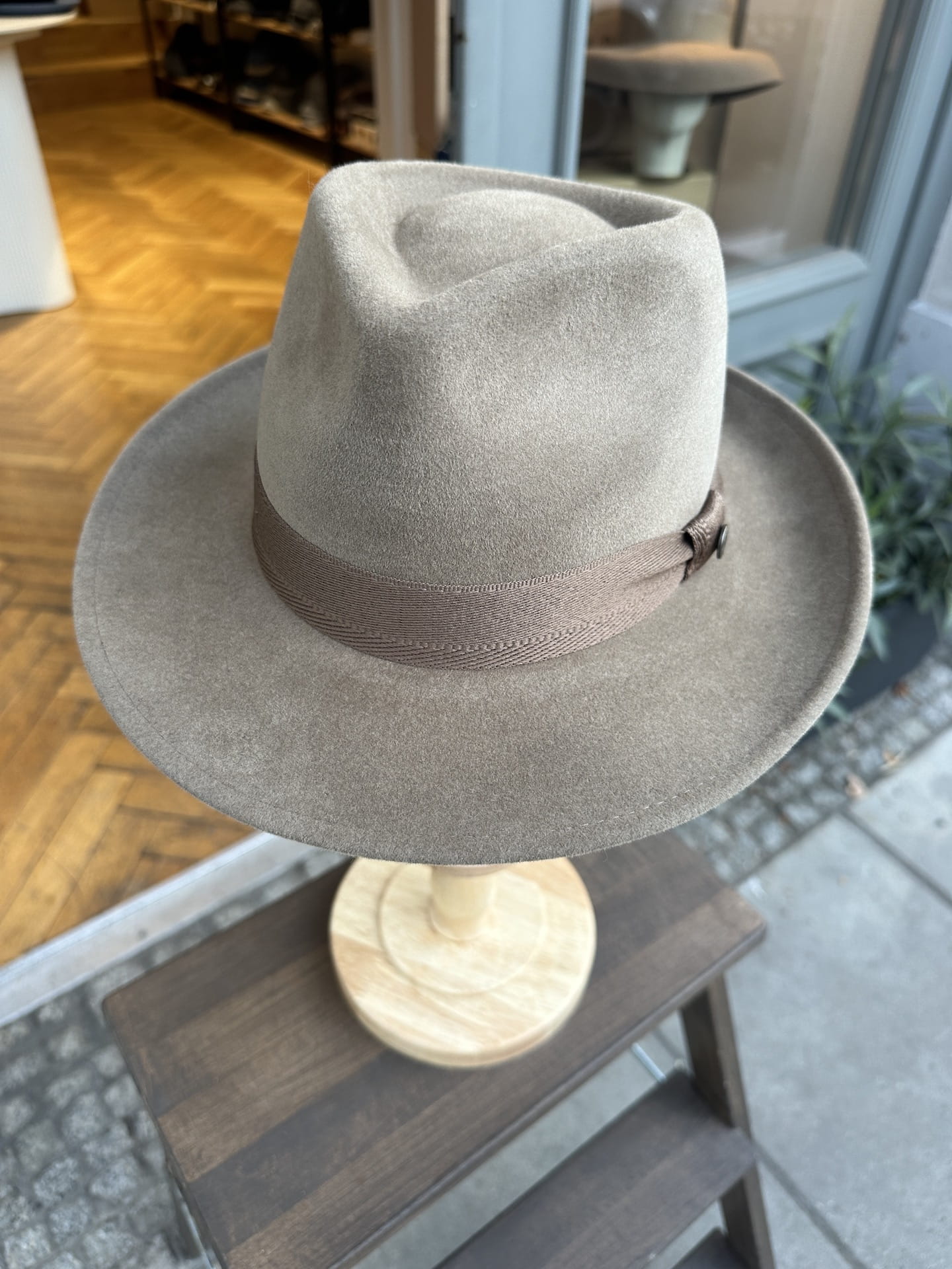 Kapelusz z miękkiego beżowego włosia króliczego prezentuje się elegancko i stylowo, dodając nutę luksusu do każdej stylizacji.