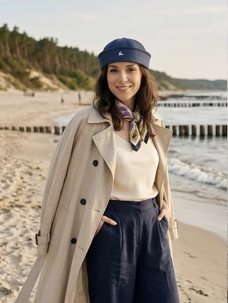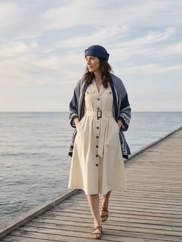 Stylowy i lekki toczek w marynarskim klimacie, idealny na lato. Wykonany w 100% z naturalnej bawełny, zapewnia komfort noszenia nawet w ciepłe dni. Klasyczny beżowy kolor sprawia, że łatwo dopasujesz go do wielu wakacyjnych stylizacji.