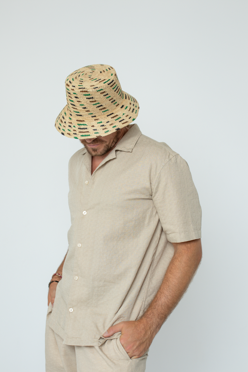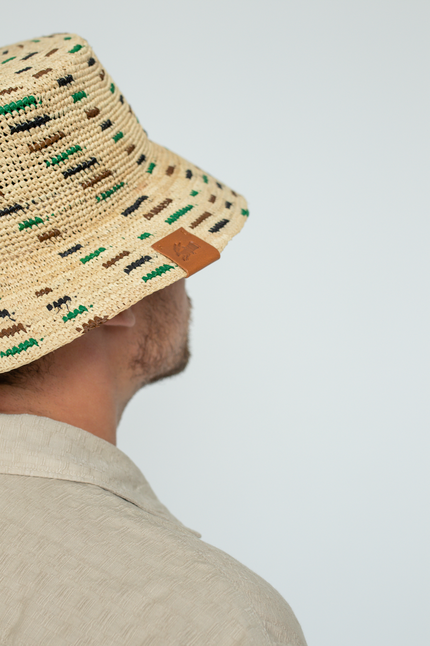 Kolor: jasno beżowa rafia z delikatnymi prążkami w kolorze: brązowym, zielonym i czarnym