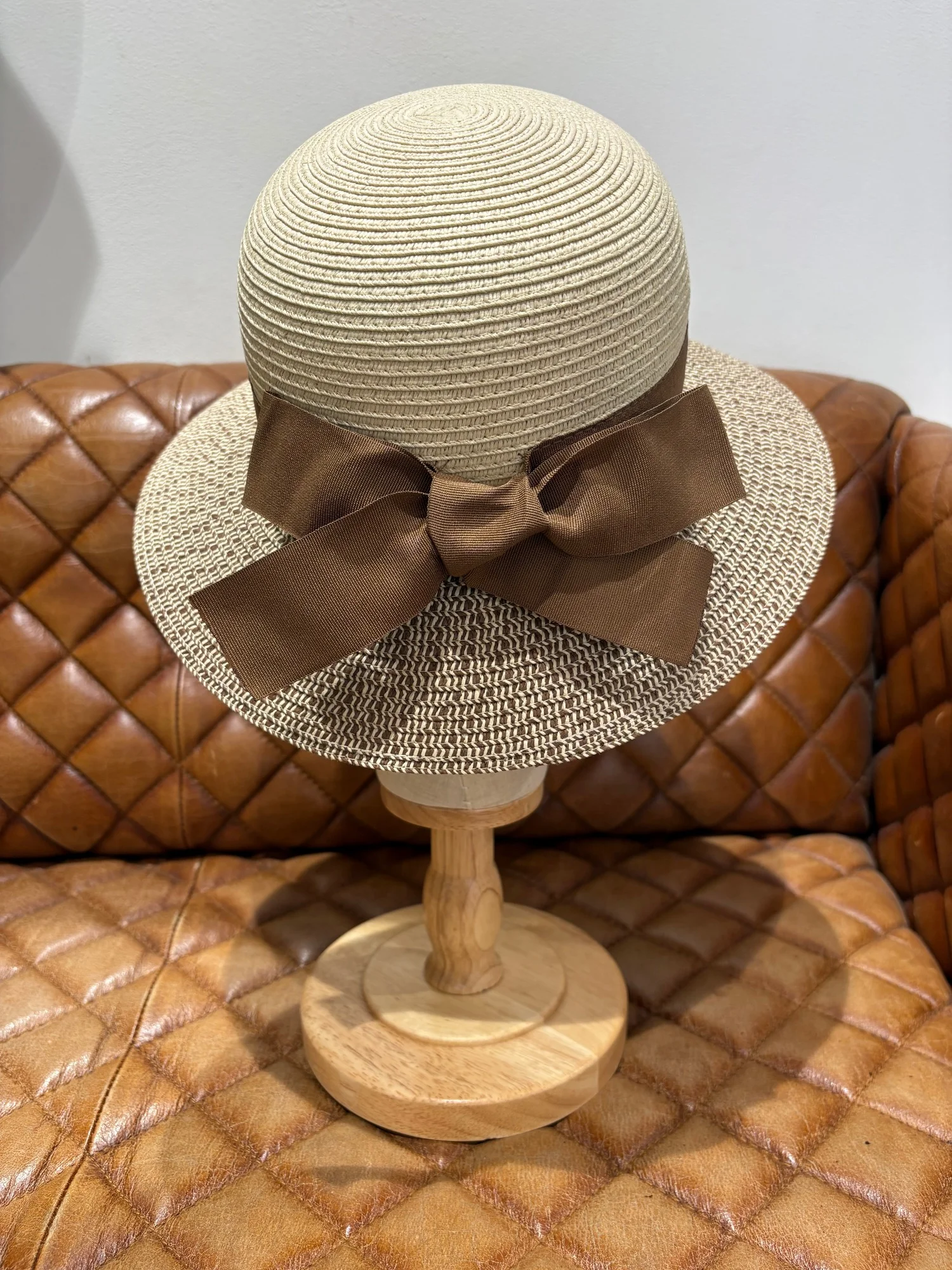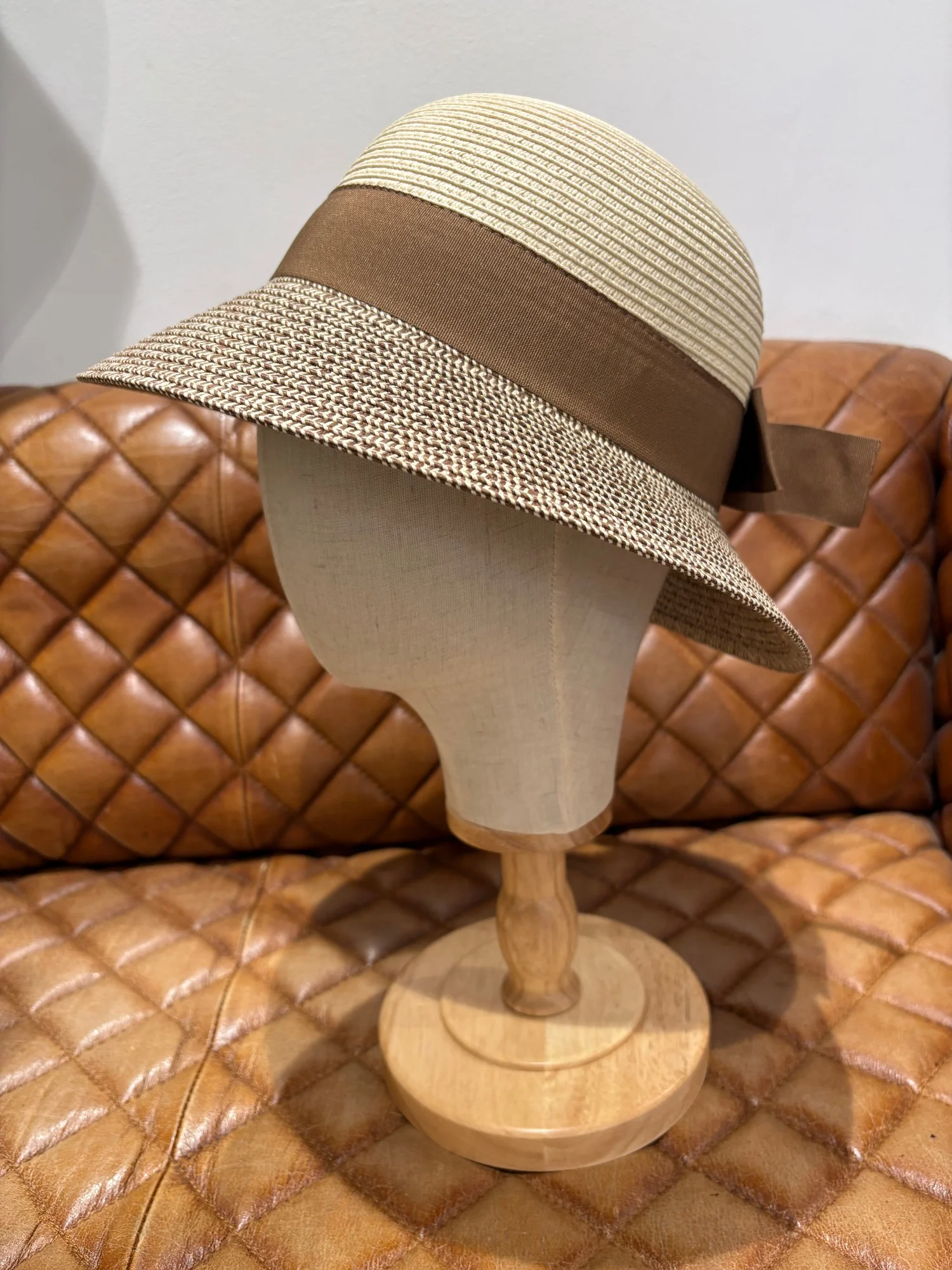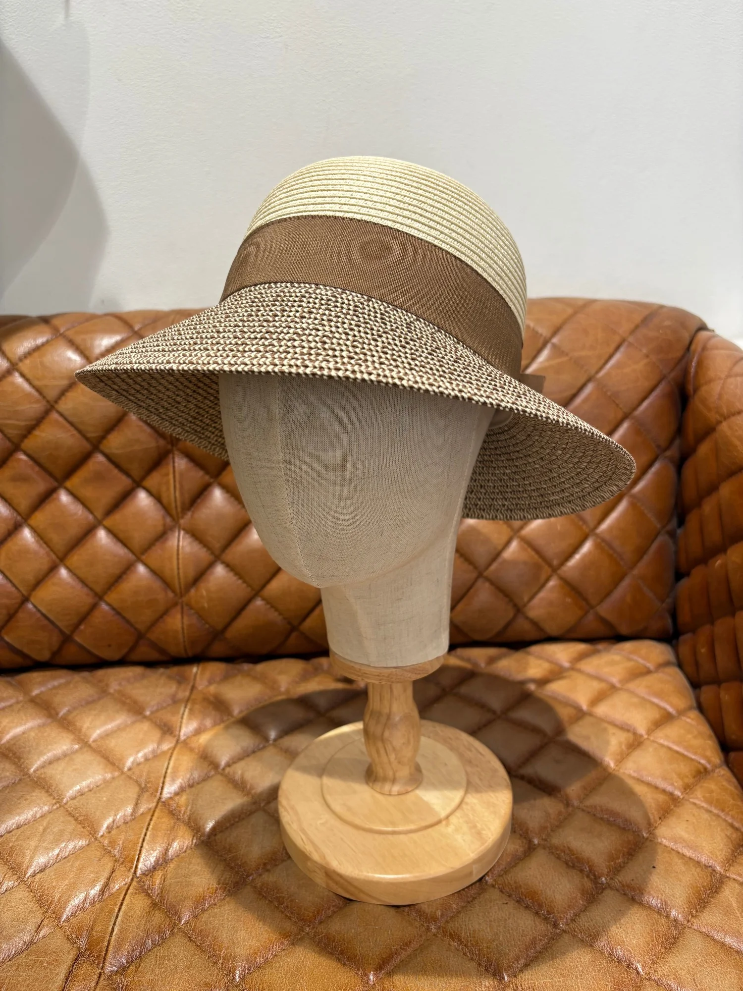 Kapelusz został ozdobiony rypsową wstążką w odcieniu brązu, która podkreśla jego klasyczny styl. Uwagę przyciąga także dwukolorowa kolorystyka – jaśniejsza główka kontrastuje z rondem w brązowym melanżu, nadając całości wyjątkowego charakteru i subtelnej elegancji.